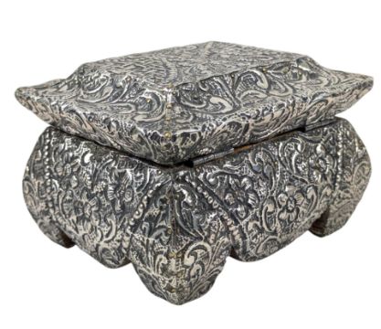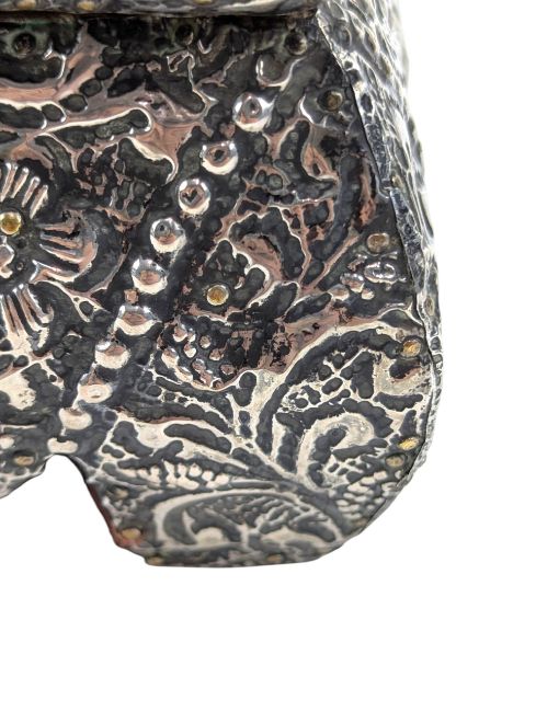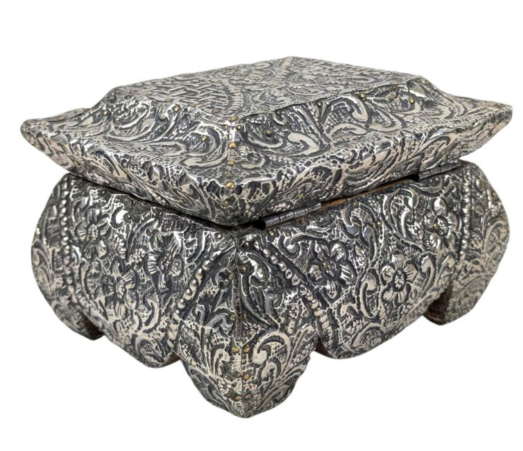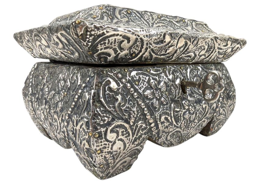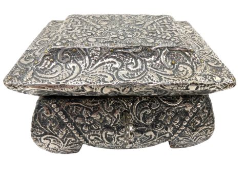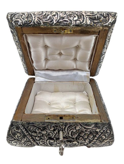 A 20th century continental silver jewellery box casket. The box being decorated with repousse flower & vignette pattern throughout. Lined with wood. Comes with a key. Gross weight approx. 587g.