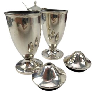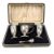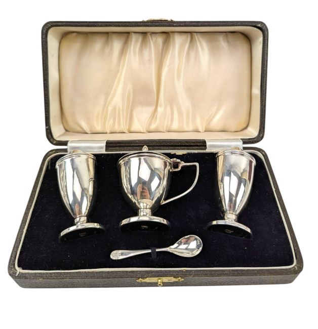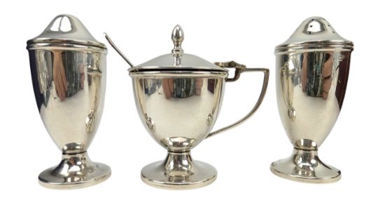A cased George VI hallmarked silver 3 piecec cruet set. The lot to include a mustard pot & salt and pepper shakers. Hallmarked year 1939, Birmingham. Sponsors marks rubbed. Completed in a presentation box. Weight approx. 123g.