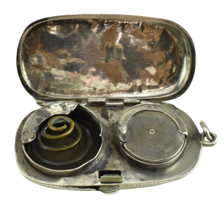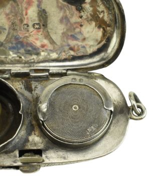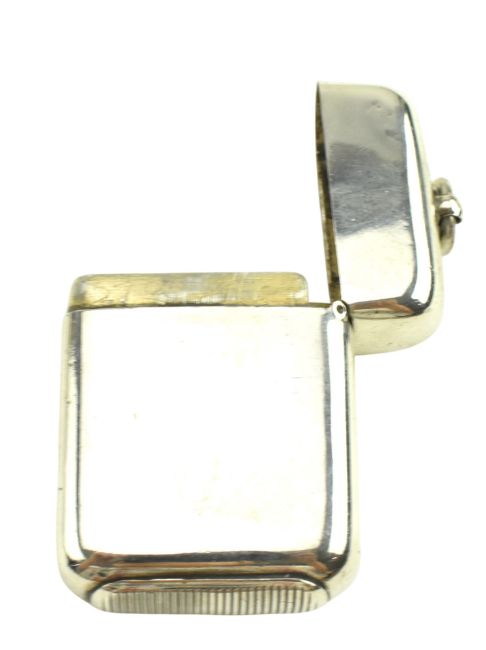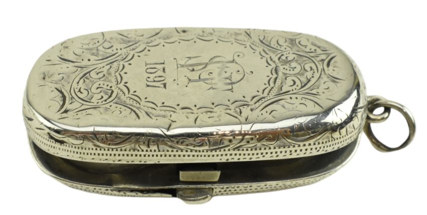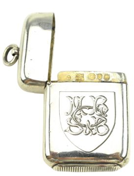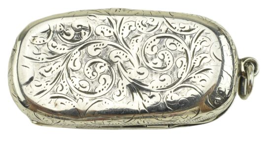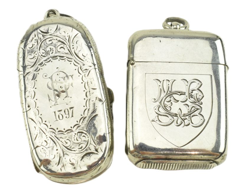 A Victorian hallmarked silver twin sovereign case. Hallmarked 1897, Birmingham. Sponsors mark for Noah Wright (?). Together with a hallmarked silver vesta case. Hallmarked year 1891, London. Sponsors mark for Goldsmiths & Silversmiths Co (William Gibson & John Lawrence Langman). Total weight approx. 61g.