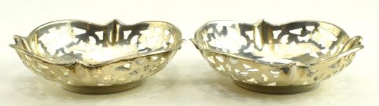 A hallmarked silver Rococo design bon bon dish raised on three ball feet. The dish being Hallmarked, year marks rubbed. Sponsors mark for Walker and Hall. Together with two small trinket dishes. Stamped Sterling silver to the base. Total weight approx. 72.4g.