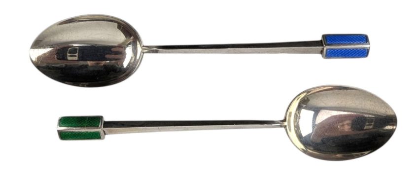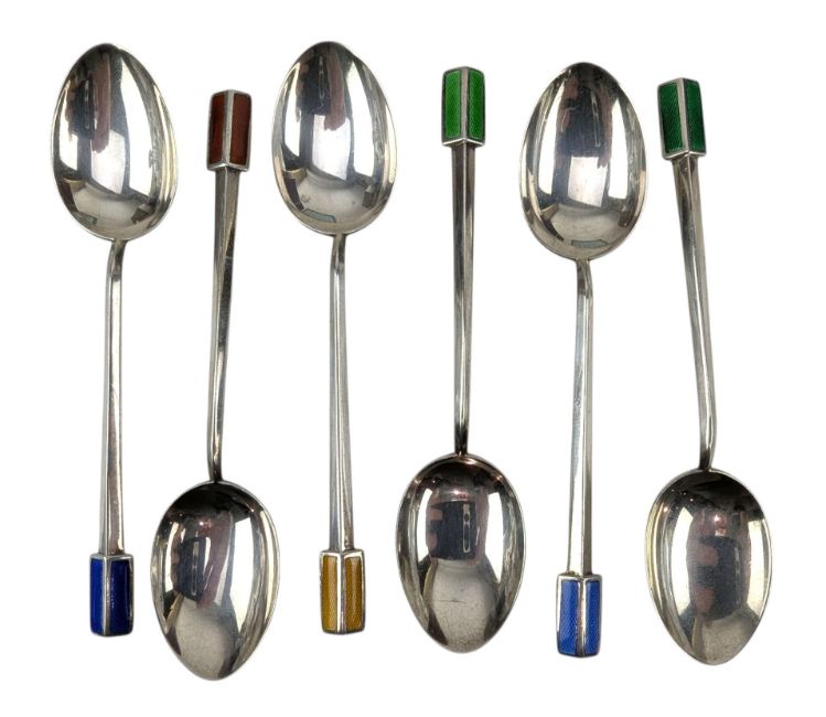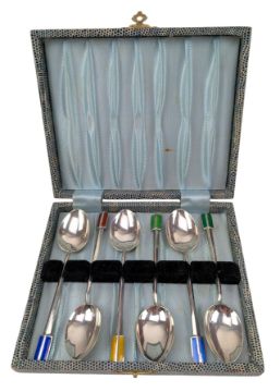 A set of 20th century circa 1930s Art Deco hallmarked silver and enamelled coffee / tea spoons set. The spoons each having guilloche enamel to the terminal. Hallmarked year 1932, Birmingham. Sponsors mark for William Suckling Ltd. Completed in a shagreen case. Weight approx. 71g.