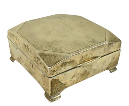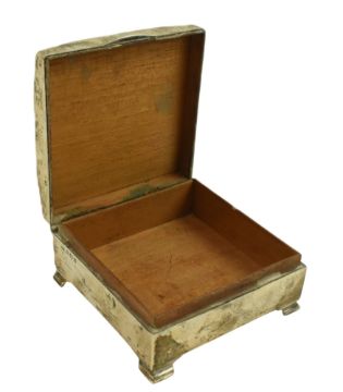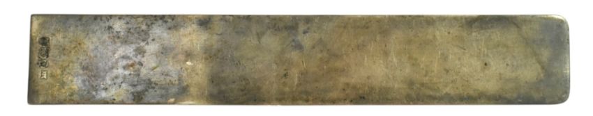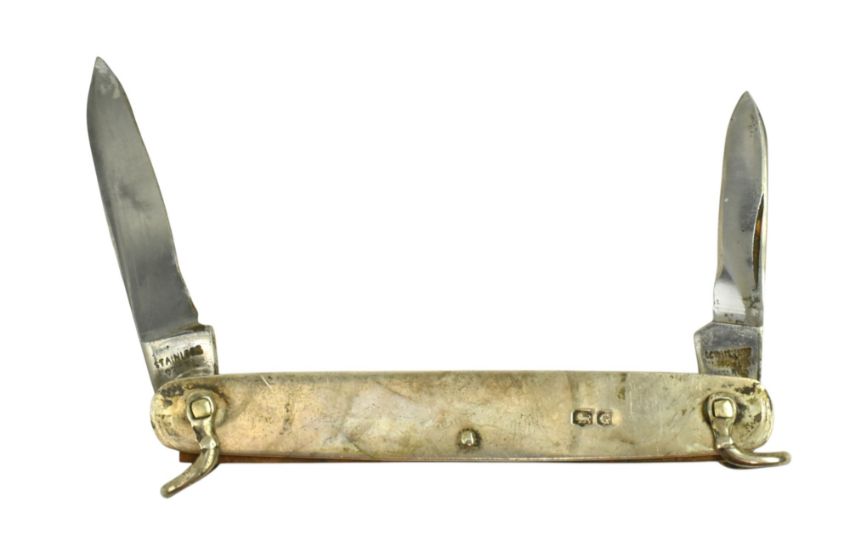 A collection of four hallmarked silver pieces. The lot to include a wood lined hallmarked silver cigarette box. Hallmarked year 1930, Birmingham. Sponsors mark for J W Tiptaft & Son Ltd. Together with a hallmarked silver bookmark. Hallmarked year 1976, Sheffield. Sponsors mark rubbed. Further together with a hallmarked silver & stainless steel two-blade folding knife. Hallmarked year 1949, Sheffield. Sponsors mark for John Yeomans Cowlishaw. Along with a hallmarked silver napkin ring. Total gross weight 316.6g.