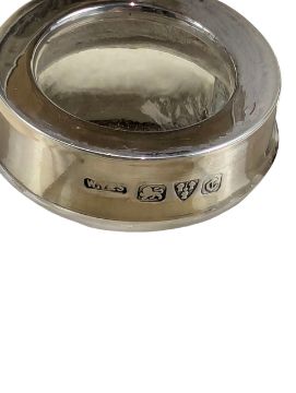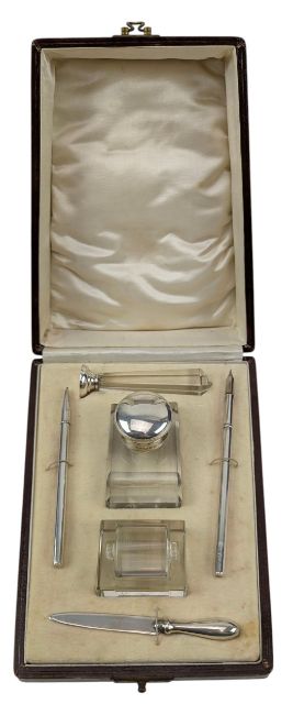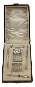 A 20th century Art Deco hallmarked silver and glass desk set. The set to include an inkwell, ink roller in stand, seal press, fountain pen, letter opener and mechanical pencil. Hallmarked year 1932,Chester. Sponsors mark for William Vale and Sons. Completed in original fitted box. Total gross weight approx. 186.7g