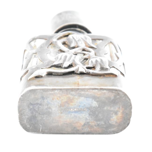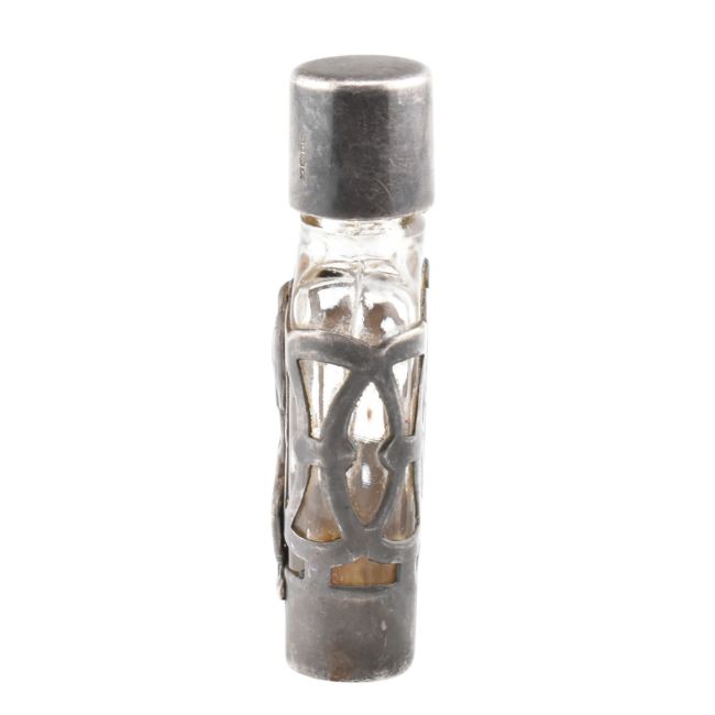 A hallmarked silver mounted perfume bottle together with a silver mounted Carrs of Sheffield easel clock. The perfume bottle hallmarked for London, sponsor mark AN, 1991. The easel clock hallmarked for Sheffield 2003. The clock being decorated with white enamel dial with bold black Roman numerals. Sponsor mark RC for Carr's of Sheffield Ltd. Total weight 104g.