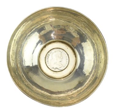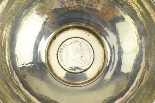 A late 19th century Victorian hallmarked silver bowl. The bowl with a short foot having a Charles II inset coin to the base. Hallmarked year 1894, Birmingham. Sponsors mark for George Nathan & Ridley Hayes. Weight approx. 264g.