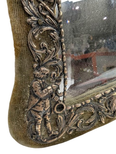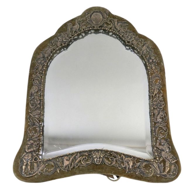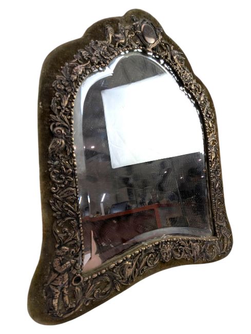 An early 20th century silver mounted shield form easel back dressing table - vanity mirror. Unmarked. Test as silver. Weight approx. 1364g.
