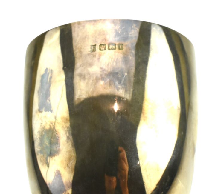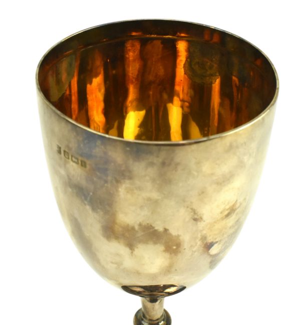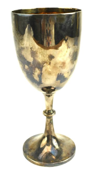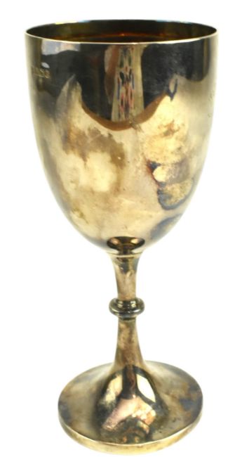 A Victorian hallmarked silver 1st prize trophy goblet. The trophy goblet supported on a slender knopped stem with a circular base. Engraved ' Madresfield Agricultural Society - 1st Prize Best Dairy Cow 1899' Hallmarked year 1897, Sheffield. Sponsors mark possibly for James Deakin & Sons (John & William F Deakin). Weight approx. 182.9g.