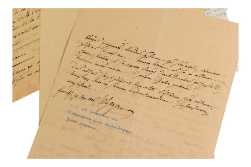 19th century German politics - Hans Christoph Ernst von Gagern (25 January 1766 – 22 October 1852), German statesman and political writer - handwritten draft essay in his hand regarding Peace in France dated 1815, plus a letter in his hand and signed regarding the sending. 'Here is the essay I mentioned recently when we were talking about politics. I had it delivered to Lord Castle Rengh by Lord N.N....' Essay fragile, with some old tape repairs. 14cm x 22cm. Plus later German translations. (4)