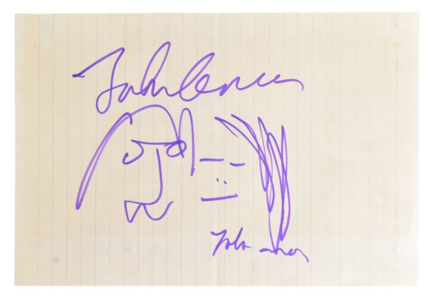 Music - The Beatles - John Lennon (d.1980) and Yoko Ono - scarce self-portrait sketch on paper by Lennon, in purple ink, signed by Lennon and Ono above and below, undedicated. Some mild discolouration to the lined paper. Total size: 13cm x 20cm.