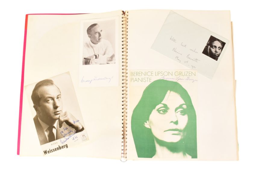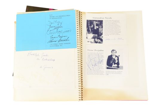 Musicians - a large album containing hundreds of autographs from various mid-20th century musicians c1960s to 1970s - all 'orchestral' related; pianists, violinists, conductors, flamenco guitarists and other such areas of music. Some loose, but most neatly laid-in to a vintage c1960s album. Some unknown, but most named. Includes: Gianandrea Noseda, Victor Tretjakov, Alexander Toradze, Louis Lortie, Alexis Weissenberg, Nerine Barrett, Berenice Lipson Gruzan, Joachim Grubich, an Austrian Quartet, Horacio Gutierrez, Karine Georgian, Mayumi Fujikawa, Yong Uck Kim, Wendell & Marjorie Nelson, Stanley Hummel, Leonhardt-Consort (signed to one sheet in red ink), Alan Hacker (signed photo and handwritten letter), Ralph Downes, Kyung-Wha Chung, Joel Waterman, Dekany Quartet, Rene Gianzoli, Marinus Flipse, a sketch by one Harald Clayton Harddison, Joseph Zwilich, Miriam Fried, Ken Sasaki, Alexandre Lagoya, Nicanor Zabaleta, Werner Haas (signed photo and TLS), Emil Dekov, Nadia Koutzen, Robert Preston, Irene Hoening, Andre Tchaikowsky, Louis Kentner, Miguel Zanetti, Charlotte Martin, Takeichiro Hirai, Carol Rosenberger, Radu Lupu, Neville Maurier, Claude Frank, Sophia Benney, Christoph Eschenbach, Gerard Hettema, and many others. Includes several signed programmes, multi-signed photos and other items. Circa 250+ signatures included.