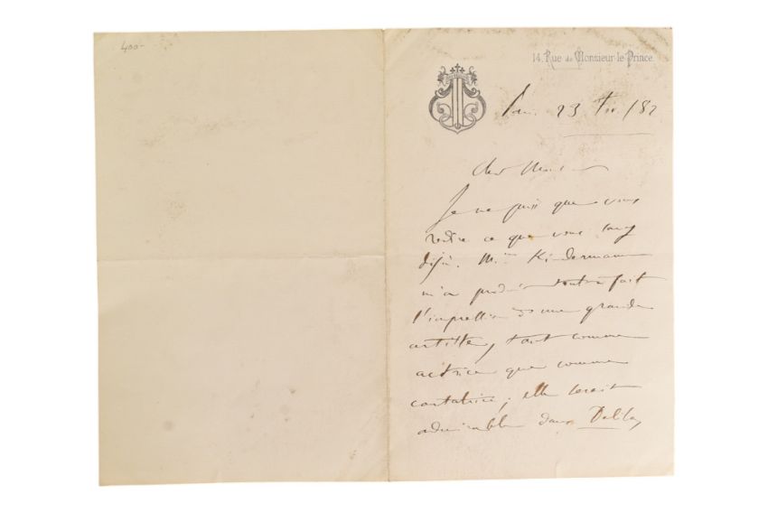 Composers - Charles-Camille Saint-Saëns (1835-1921) - ALS in black ink, dated March 14th 1882, in which Saint-Saens gives his opinion on the talent of Mme. Kindermann. Headed stationery. Three sides. 8vo. An original catalogue description is present from an unknown institution. 18cm x 23cm.