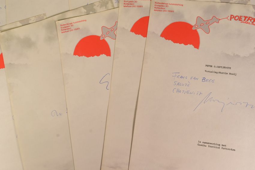 Poets - a large collection of autographs from various poets, all circa 1970s. Many signed to 'Poetry '75 International' festival headed sheets, others on paper. Includes: Philip Levine, Keorapetse Kgositsile, Jacques Izoard, Michael Hamburger, Aleksander Galitsj, Peter O. Chotjewitz, T. Carmi, Edward Braithwaite, H. C. Artmann, Czelaw Milosz, Waldo Rojas, Raphael Rudnik, Mongane Wally Serote, Kazuko Shiraishi, Jean Tardieu, omas Transtromer, a 'Poetry International Rotterdam 1971' programme sheet signed by all those attending, ditto for 1973, and others. Quantity. Mostly A4.