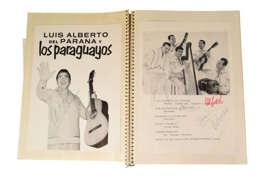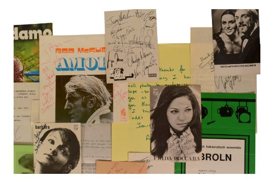 Music - a large album of autographs from the world of music in the 1960s and 1970s (some other dates). Includes signed photographs, letters, cards, clippings etc. Some loosely laid-in, others loose. Includes: Iwan Rebroff, David & Marianne Dalmour, Ronnie Aldrich, Buck Owens and the Buckaroos, Shirley Bassey, Luis Alberto (and his band), a Fiddler On The Roof programme signed by many of the cast, Zarah Leander, Sheila Southern, Guy Fletcher, Ray Stevens, Tommy Steele, Will Ferdy, Ray Davies (of The Button Down Brass), The 5th Dimension, Cliff Richard (signed rosette), Vince Hill, The Beverly Sisters, Anita Kerr, Von Trapp, Magna Carta (band signed photograph and letter), Bertice Reading, Samantha Jones, The New Seekers, Steve Miller, Chris Montez, Donna Hightower, Don McLean, Dionne Warwick, LAbi Siffre and The Peddlers, The Four Tops, Andres Batista, Alvin Lee and others. 60+ autographs.