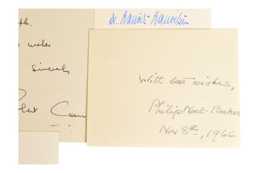 Politicians & Dignitaries - a collection of x20 vintage c1960s & 1970s autographs from various all-world politicians and dignitaries. Includes: Philip Noel-Baker (autograph and a vintage press photo), Violet Bonham Carter, signing as Asquith of Yarnbury - letter and autograph on paper, Air Chief Marshal Sir John Gundy, Dr Lauritz Lauritzen, Jens Malling, Ralph J Bunche (letter and photograph), Emilio Colombo, Vice President Hubert Humphrey, Lawrence F. O'Brien, Henry H. Fowler, David Dean Rusk, Robert Carr (British Embassy headed stationery), Charles Edison, Pete Parker Hart, Christian Herter, James Roosevelt, Adam Malik, and Mohammad Hatta. Photographs, letters and paper. Various sizes.