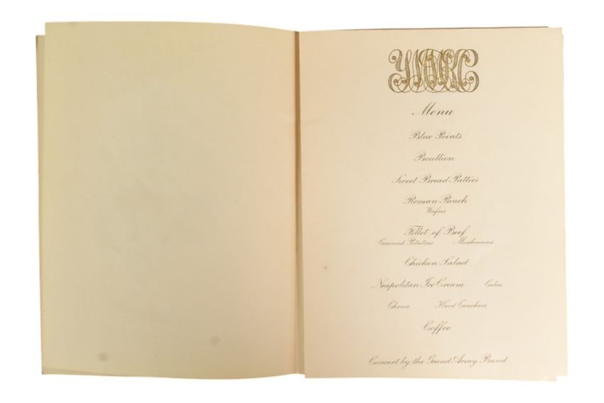 American History - a Banquet menu from the 'Young Men's McKinley Club, Canton, Ohio' held on Tuesday January 31st 1905 'to commemorate the Birthday of William McKinley'. Featuring a facsimile signature beneath an etched image of McKinley to the first page, embossed burgees to the top of each page, and details of the event - including speakers - throughout. 5pp, 20cm x 16cm.