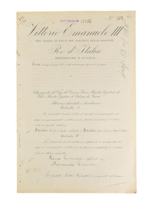 History - Victor Emmanuel III (1869-1947) Former King of Italy 1900-1946 - signature to the reverse of a decree, signed in black ink. Various official stamps, with a date of 5th Nov. 1936. Other official signatures and stamps present. 37cm x 24cm.