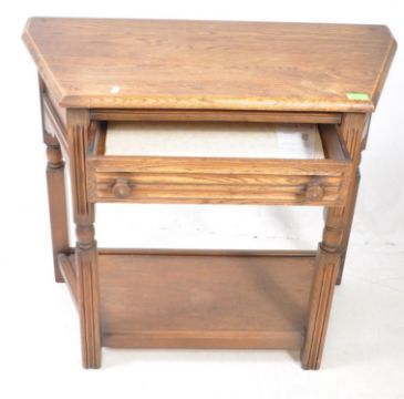 20th century Jacobean revival oak console hall table. Raised on reeded turned legs with a single drawer having knob handles. Solid oak wood top above and lower tier below. Measures approx: 73x80x36cm