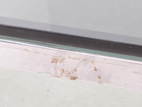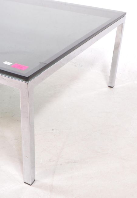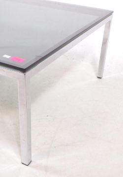 A mid century chrome and smoked glass low coffee / side table in the manner of Merrow Associates. Measures approximately 35H x 74W x 74D in centimeters.