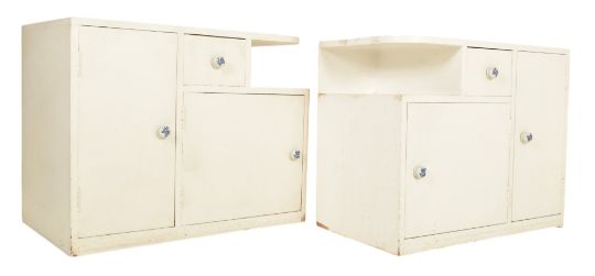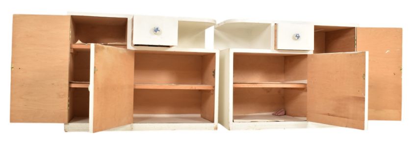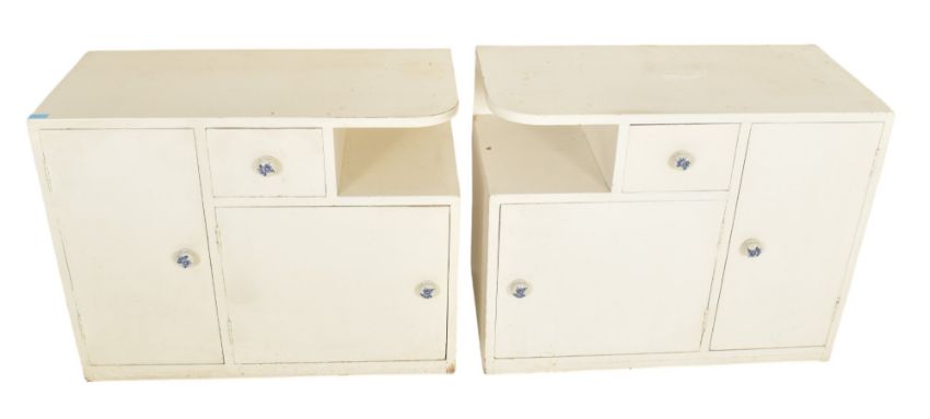 A pair of mid century painted bedside cabinets. White colourway with decorative handles having drawers and cupboards to each. Each measures approx. 66cm x 86cm x 41cm.