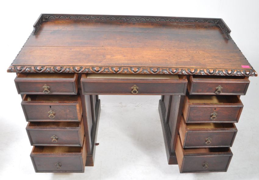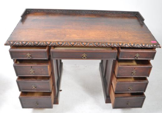 Victorian 19th century carved oak twin pedestal desk. The desk with gadrooned edge top over pedestal drawers being raised on a plinth base. Measures approx: 79x121x60cm