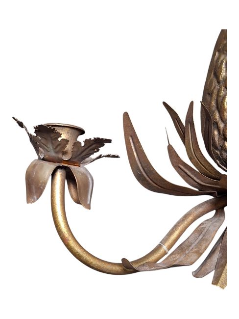 A 20th century Hollywood Regency brass pineapple wall sconce. The sconce having hanging point atop, with large repousse pineapple decoration to center and brass leaves above. Having curved arms to lower with candle holders at ends.