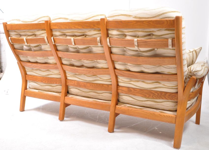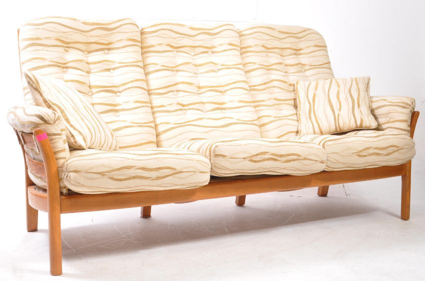 Ercol Furniture - A vintage 20th century Ercol Saville elm framed sofa. The three seater settee with bentwood frame in elm having cushioned arm rests, seat, and back rests. Having cream patterned upholstery. Measures approx: 100x190x93cm
