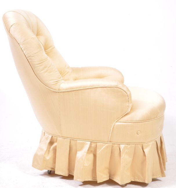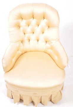 Victorian 19th century bedroom / nursing chair with button back and turned legs with castors. Re-upholstered in cream fabric. Measures approx: 87x70x80cm