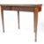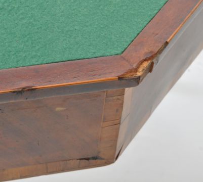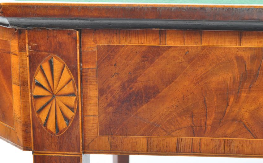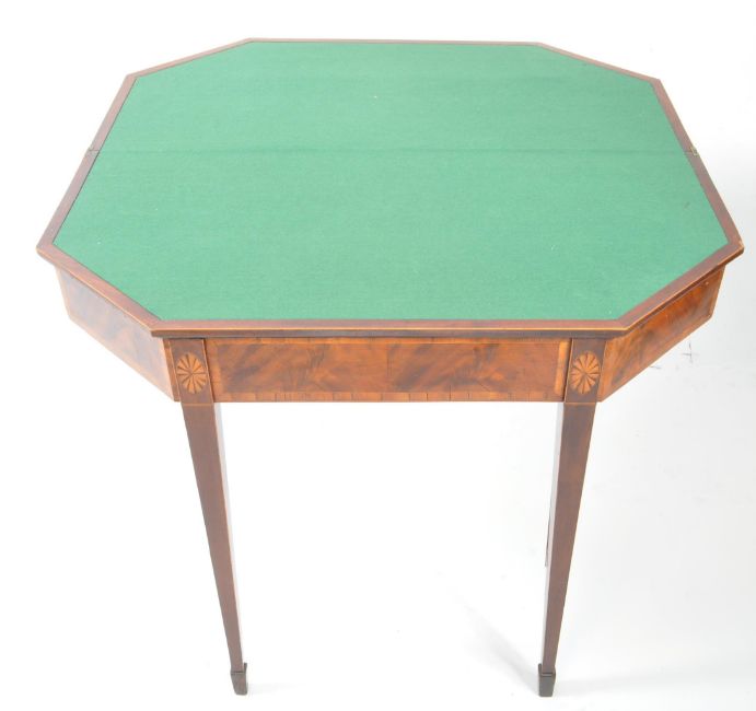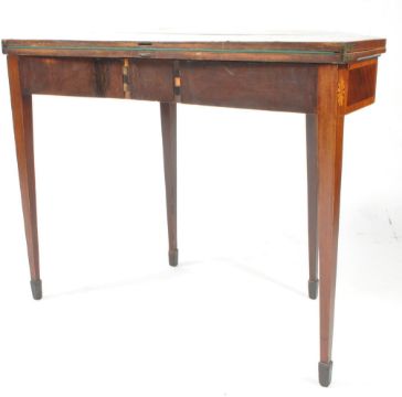 A George III 19th century walnut and line inlaid games - card table . The table having canted edges to fold out top with crossbanding, opening to reveal a baise table top. With inlaid florals to frieze over tapering sheraton type supports. Measures approx: 74x91x91cm