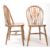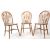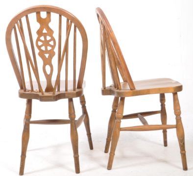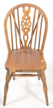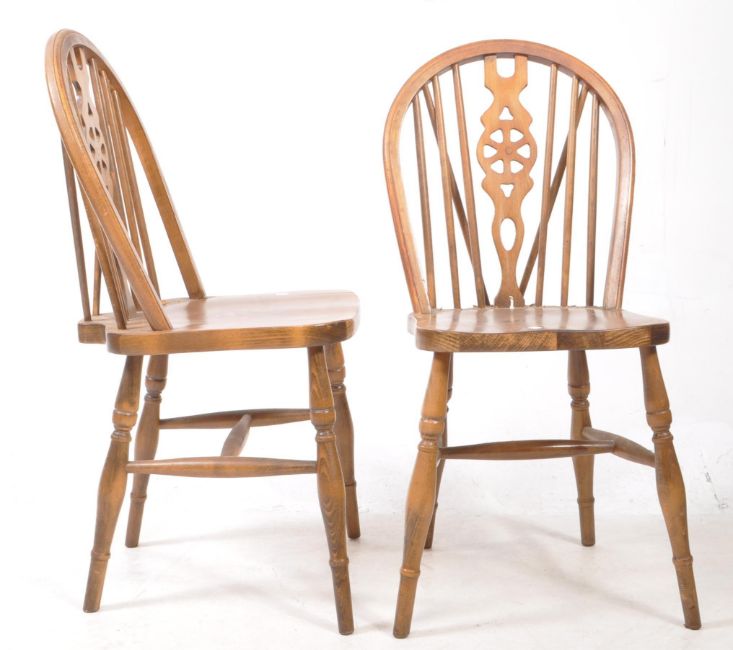 A set of three 20th century wheelback dining chairs. The chairs each raised on turned supports, united by stretchers, with hoopback back rests featuring pierced shaped wheelback splat alongside rounded spindles. Measures approx:90x38x44cm