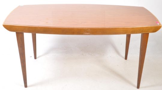 British Modern Design - A mid century teak veneer dining table. Rectangular form woth tapering upright circular legs. Measures approx: 75x155x78cm
