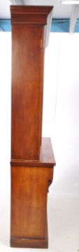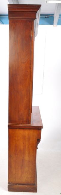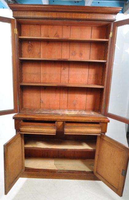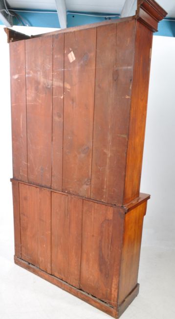 A 19th century Victorian mahogany library bookcase. The cabinet having cupboard to lower, raised over a plinth base. Featuring glazed window bookcase to top with flared cornice above. Measures approx: 215x121x41cm