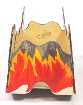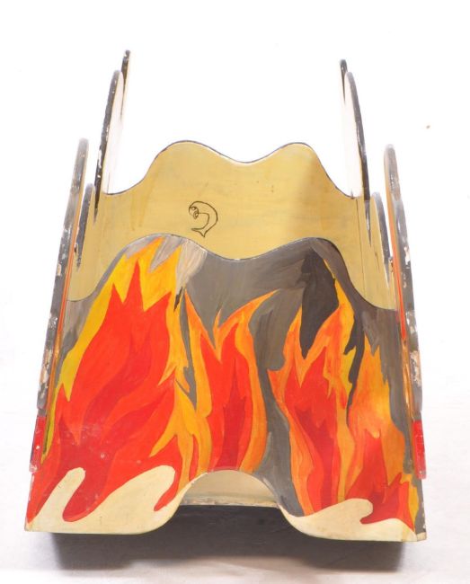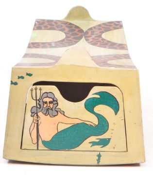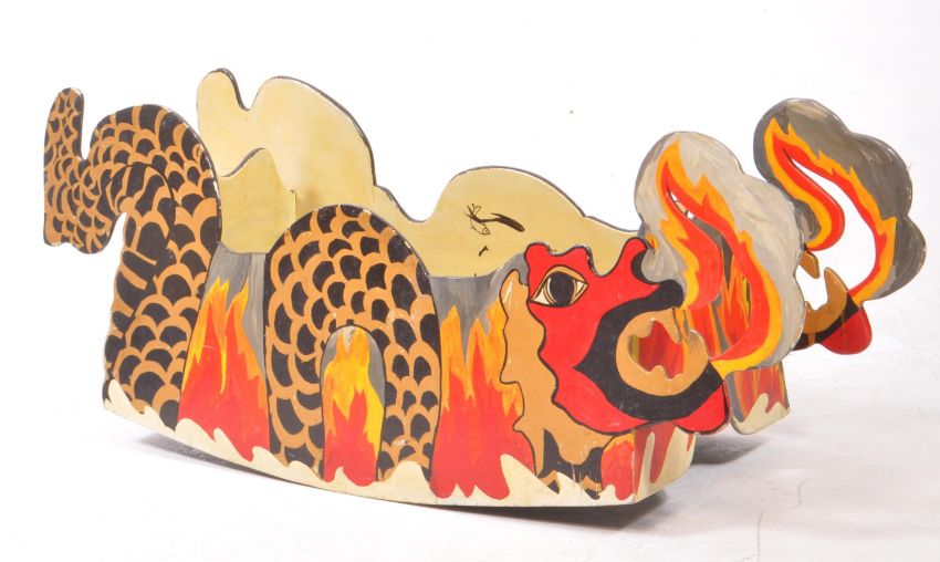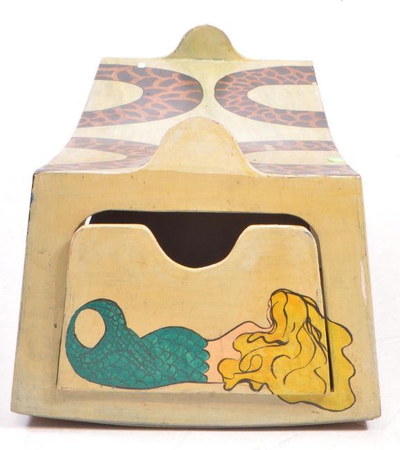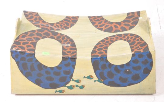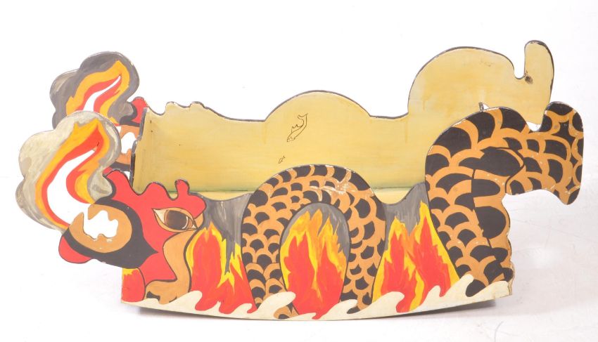 Two mid 20th century painted folk art carnival boxes / cases. Inverted bow form with hand painted leopard print. Together with a sit in dragon example. Painted by British artist, Rosalind Grimshaw. Measures approx: 45x110x41cm