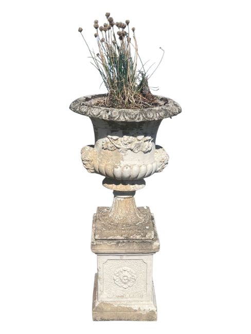 Two 20th century stone garden campana urn planters. Each with gadrooned basins with masks to side, upon plinth bases with Tudor roses in relief. Measures approx: 106x48cm