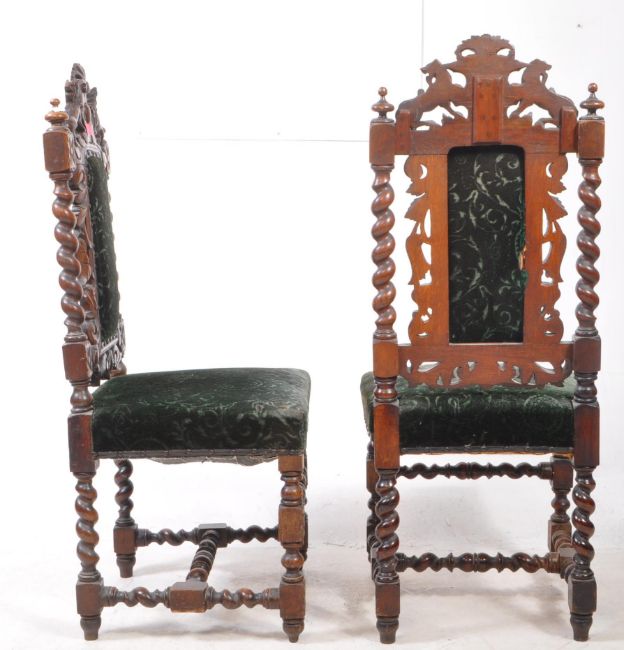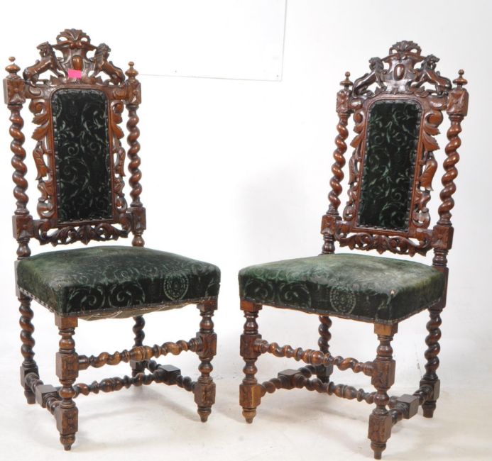 A pair of 19th century Carolean revival carved oak hall chairs. The chair raised on barley twist supports, united to lower by H stretcher. Featuring upholstered seat and backrest. With carved acanthus leaf and lions flanking armorial crest atop. Measures approx: 111x48x44cm