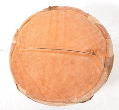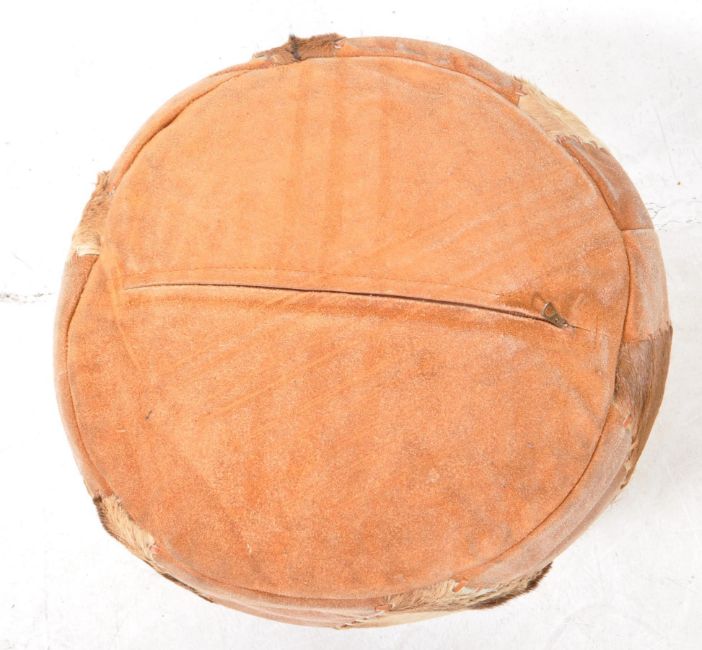 A vintage 20th century calf animal hide footstool / pouffe. Cicrulcar form with stitched panels to sides and top. Measures approx:33x41cm