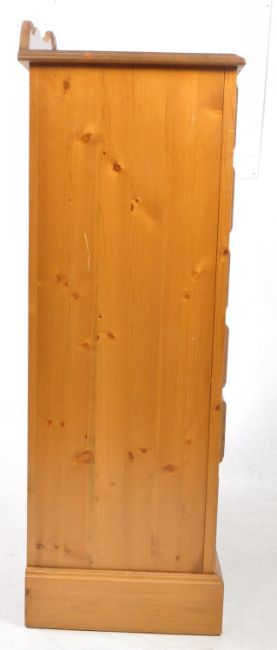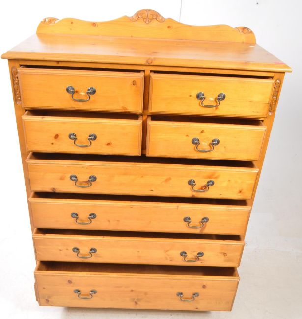 A vintage 20th century large pine chest of drawers. With a carved gallery back, configuration of four short drawers above four full lengths. Raised on carved bracket feet with metal swing pulls. Measures approx:137x105x45cm
