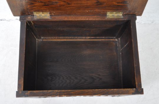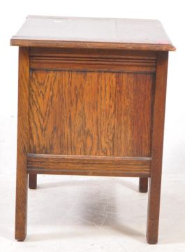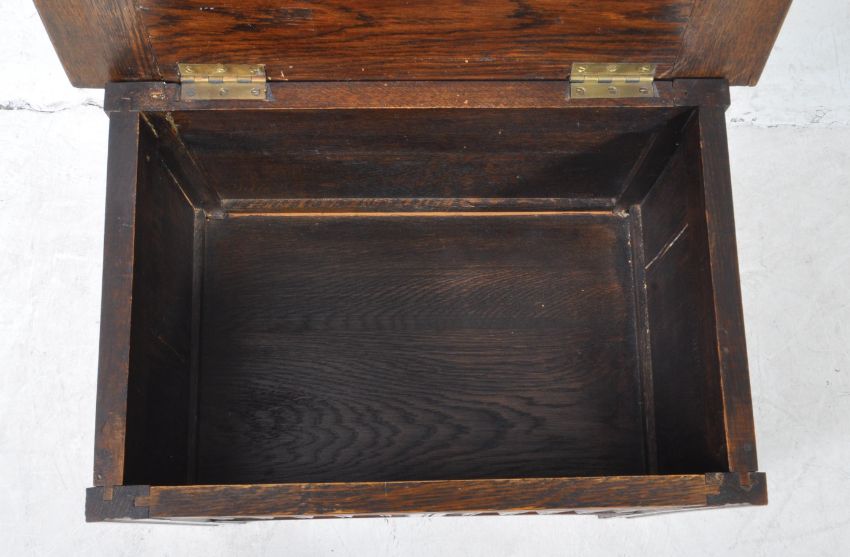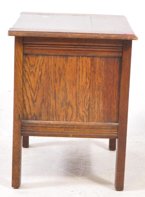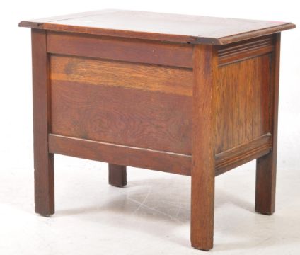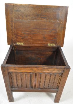 Early 20th century oak coffer chest. The chest of small proportions having carved linen fold design. Raised on squared legs. Measures approx: 46x53x36cm