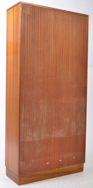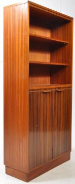 Morris of Glasgow - A vintage mid 20th century bookcase display cabinet. The cabinet raised on a plinth base, featuring twin door cupboard to lower. Having bookcase shelves to upper. Measures approx: 145x69x38cm