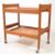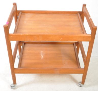 British Modern Design - A vintage mid 20th century teak wood trolley. Having twin tiers with gallery edges raised on block supports over castors. Measures approx: 75x75x49cm