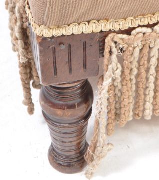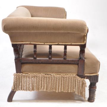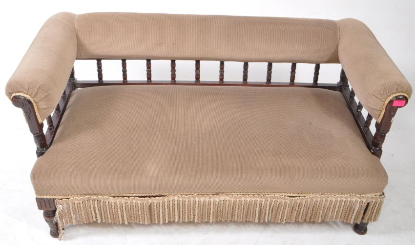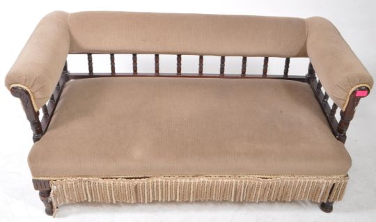 Victorian 19th century mahogany salon sofa. Raised on turned legs with overstuffed seat and back rest with gallery arms. Measures approx: 62x130x65cm