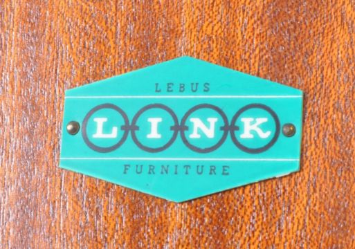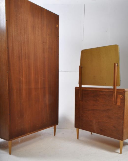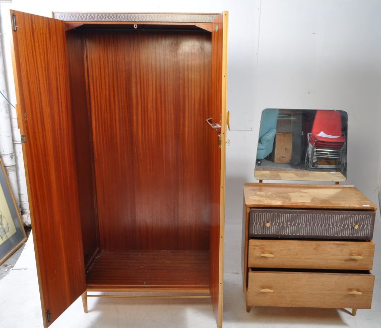 Mid Century Lebus dressing chest of three drawers in oak, with mirror above, from their Link range. The top drawer has a unique pattern to the front and differing handles from the other two drawers. Raised on tapering round section legs. Together with wardrobe. Measures approx: 181x92x53cm