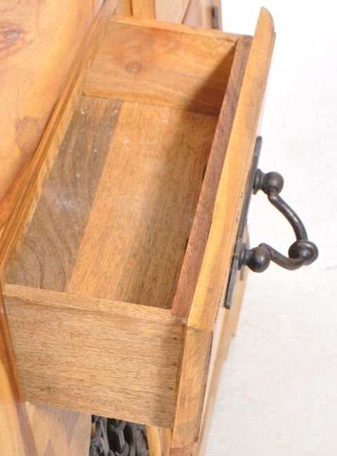 A vintage late 20th century sheesham Indian hard wood sideboard credenza. The sideboard raised on bracket feet. Featuring a pair of doors to lower, each with exposed ironwork windows, below a pair of drawers. Measures approx:83x95x46cm