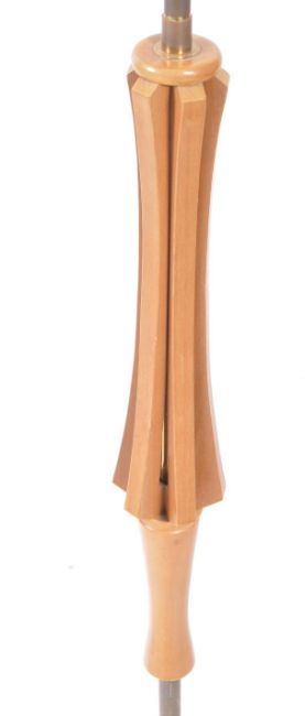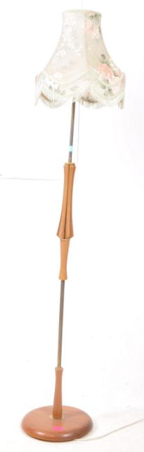 British Modern Design - Mid century teak and metal floor standing standard lamp. Circular teak foot with teak and metal central column with pierced teak panel with floral lamp shade and fixing to top. Measures approx: 164x38cm