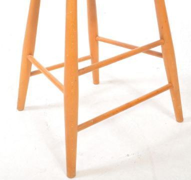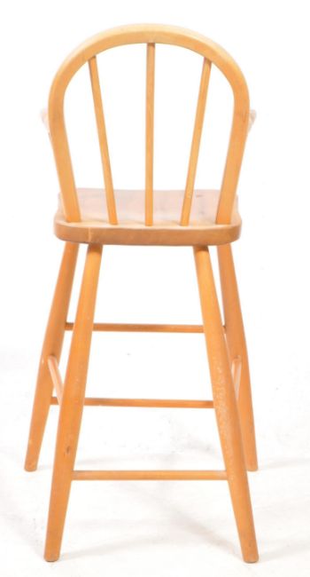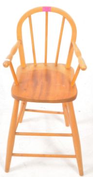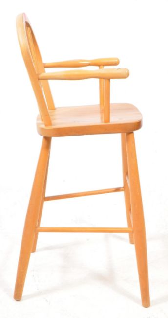 A vintage 20th century manner of Ercol large beech wood childs high chair. The chair having hoop backrest with spindle back, raised on turned legs united by stretchers. Measures approx: 81x36x41cm