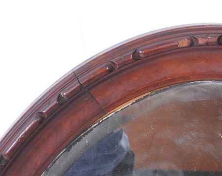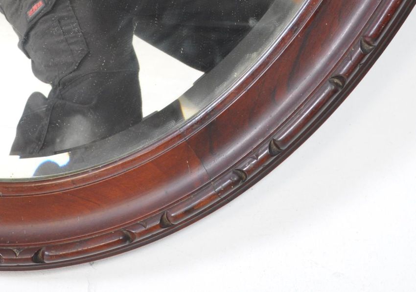 A vintage 20th century large mahogany wall mirror. Oval form with central bevelled edge glass panel, carved border with hanging chair to back. Measures approx: 87x62cm