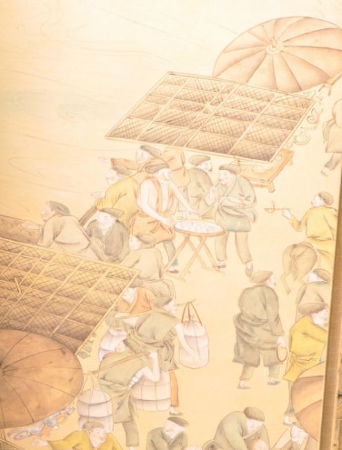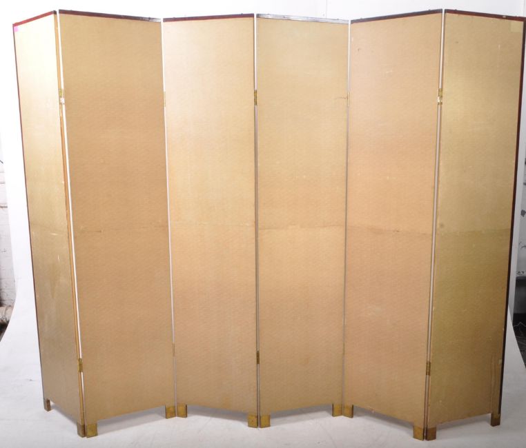 A vintage 20th century hand painted Asian style six panel room changing discretion divider screen. The screen having mahogany exterior with metal banding and feet. Measures approx:183x246cm
