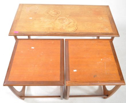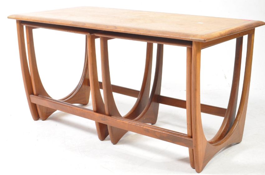 G-Plan - A vintage mid 20th century G-Plan Astro teak nest of tables. The table of rectangular form with bordered decoration to top, having two smaller nesting tables below. Each featuring the quadrille style legs united by rear stretcher. Measures approx: 52x99x49cm