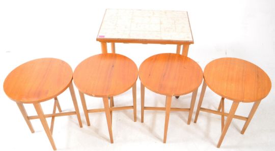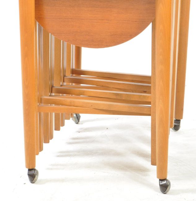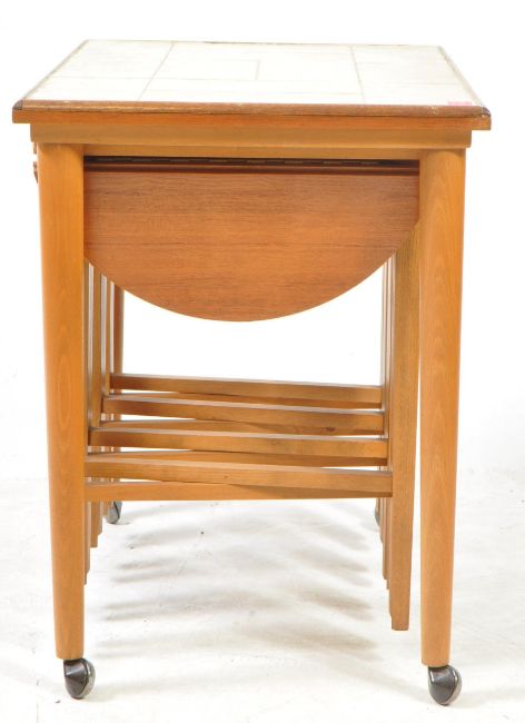 After Poul Hundevad - A retro mid 20th century circa 1960s Danish inspired quartetto nest of tables. The nest featuring foru drop leaf tables underneath a coffee table raised on tapering legs over castors. Having tile top to large table. Measures approx: 57x62x42cm