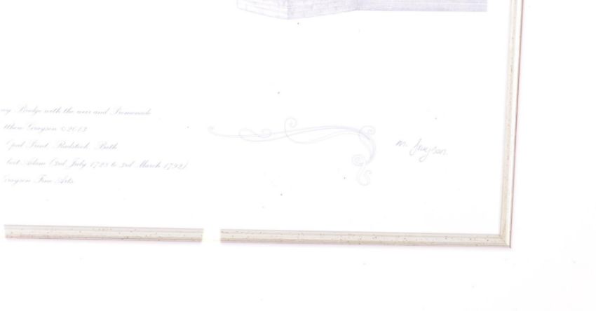 After Matthew Grayson (B. 1965) - Two 21st century Bath related prints. Comprised of 'The South West prospect of Bath Abbey 2003' limited edition 11/25 signed in pencil, as painted by Grayson 2007 published by Grayson Fine Arts, and 'Perspective drawing study of Pulleney Bridge with the weir and Promenade', limited edition 1/50 signed by the artist, as drawn by Grayson 2013. Both framed, mounted and glazed. Largest measures approx: 57x67cm