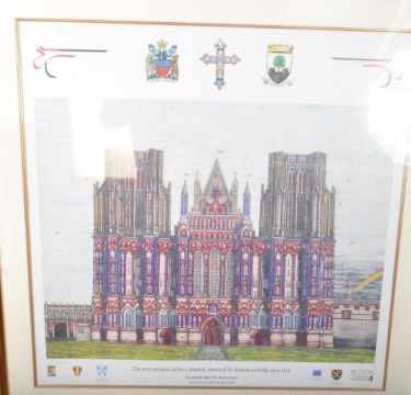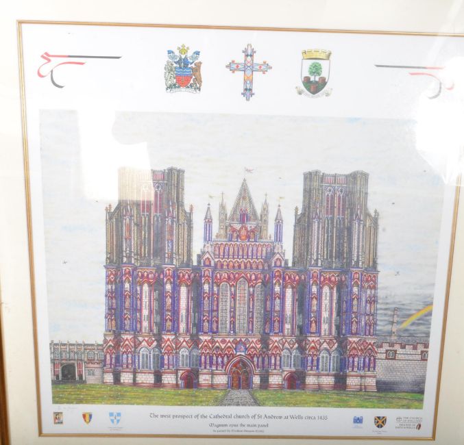 After Matthew Grayson - 21st century coloured Wells Cathedral print titled 'The West Prospect of the Cathedral Church of St Andrew at Wells circa 1435' as painted by Grayson in 2005. Limited edition no. 11/75 and signed by the artist. Framed, mounted, and glazed. Measures approx: 115x85cm